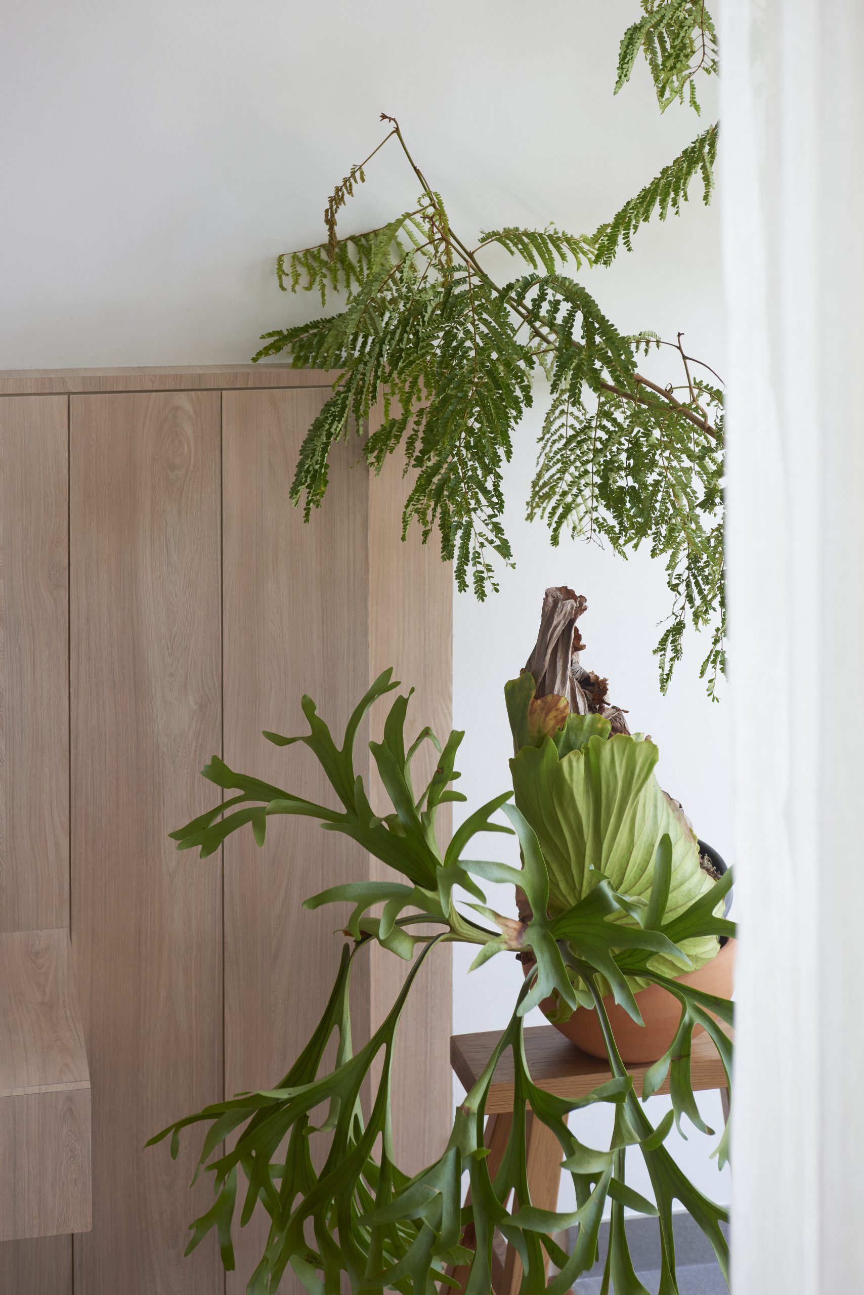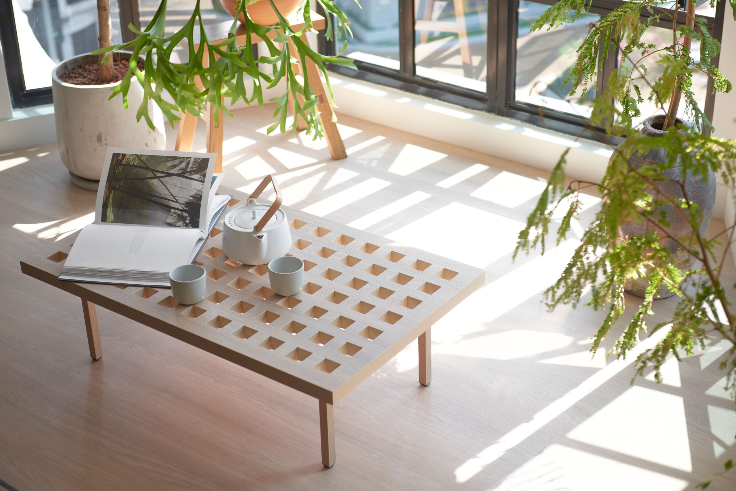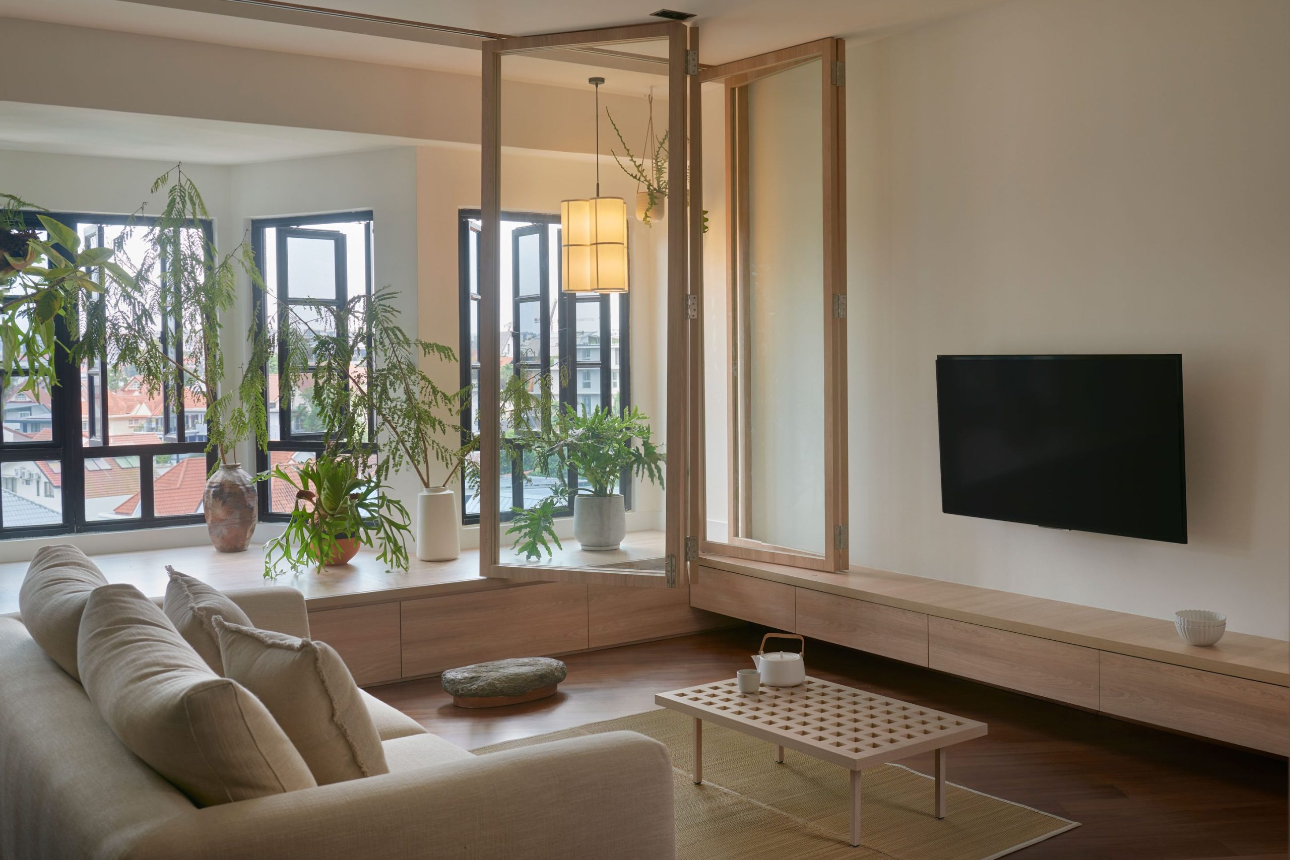 The unit’s odd-shaped layout adds an interesting spatial dynamic to this elevated space, offering up wide as well as more cosy seating nooks that are inviting and intimate in equal measure. The raised platform was introduced to help the plants get more sunlight and fresh air, and brings the apartment’s residents closer to the tall windows that span the entire length for the enjoyment of the view, breeze, and the dappled light that cast through the leafy plants.