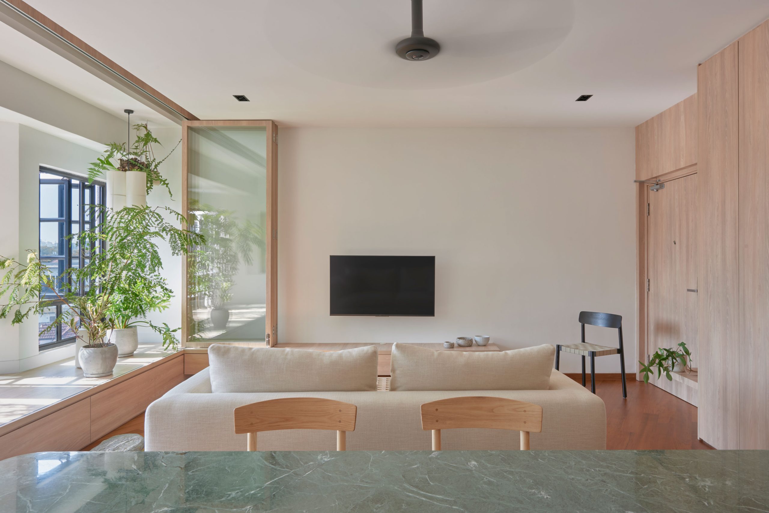 We enjoyed the apartment’s original layout as it was generally a sensible one. The only thing it lacked was a balcony to invite more fresh air and natural elements into the space. This ‘missing piece’ thus became the driving force of the design strategy.