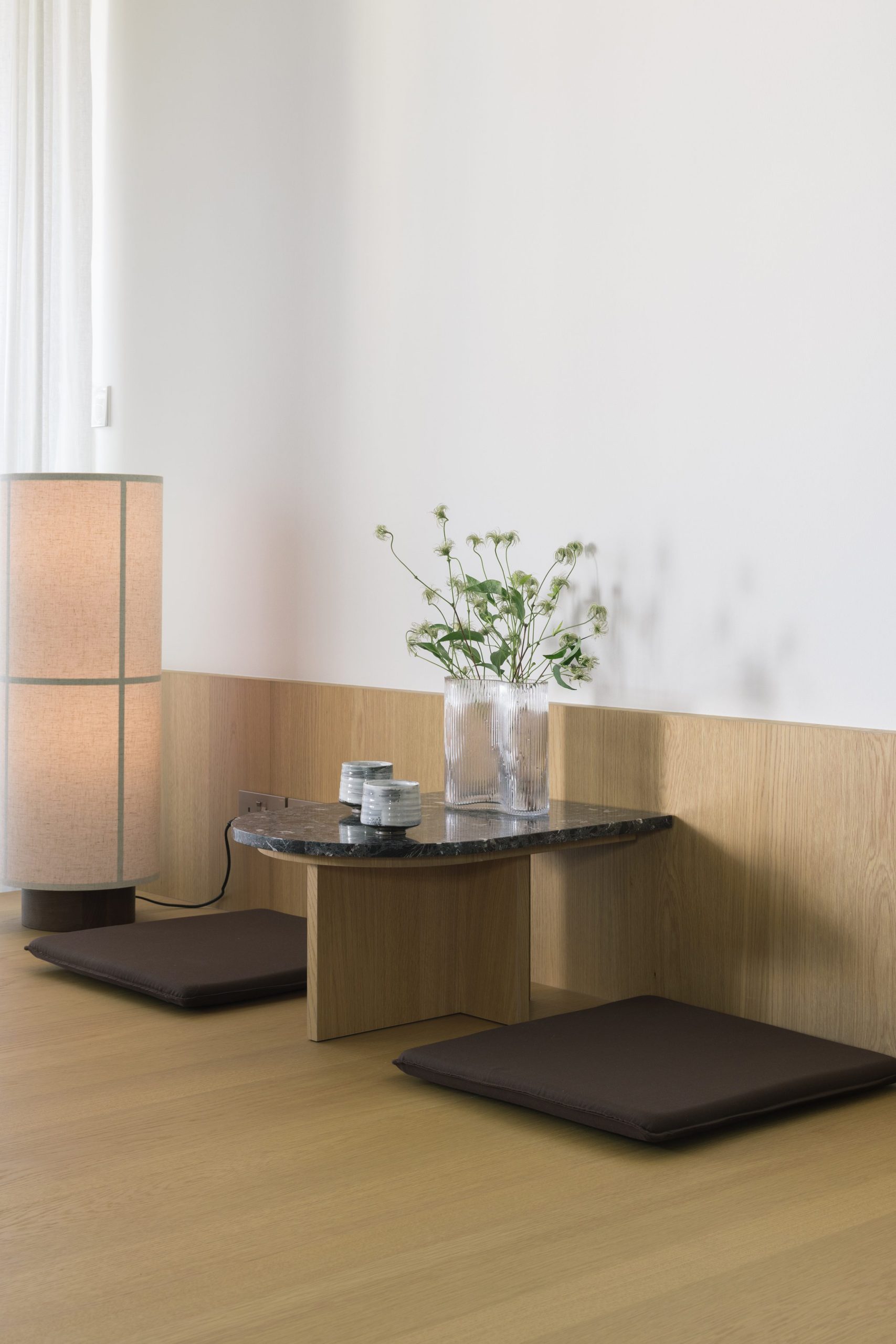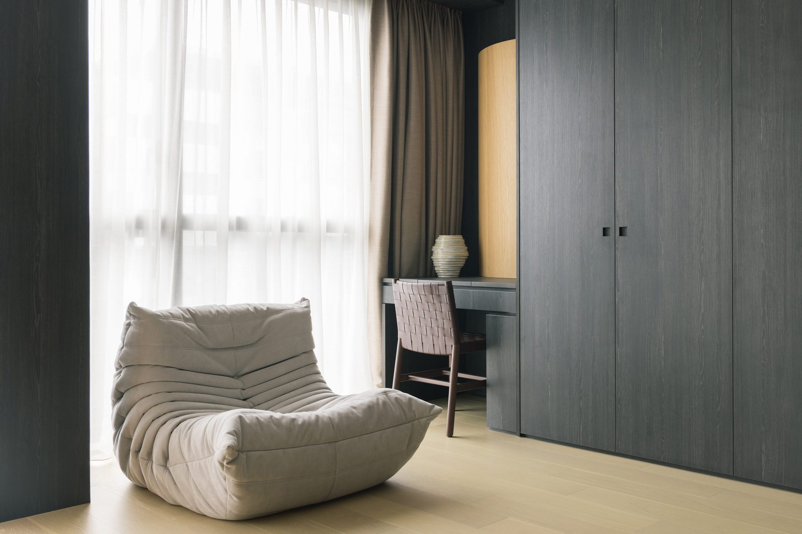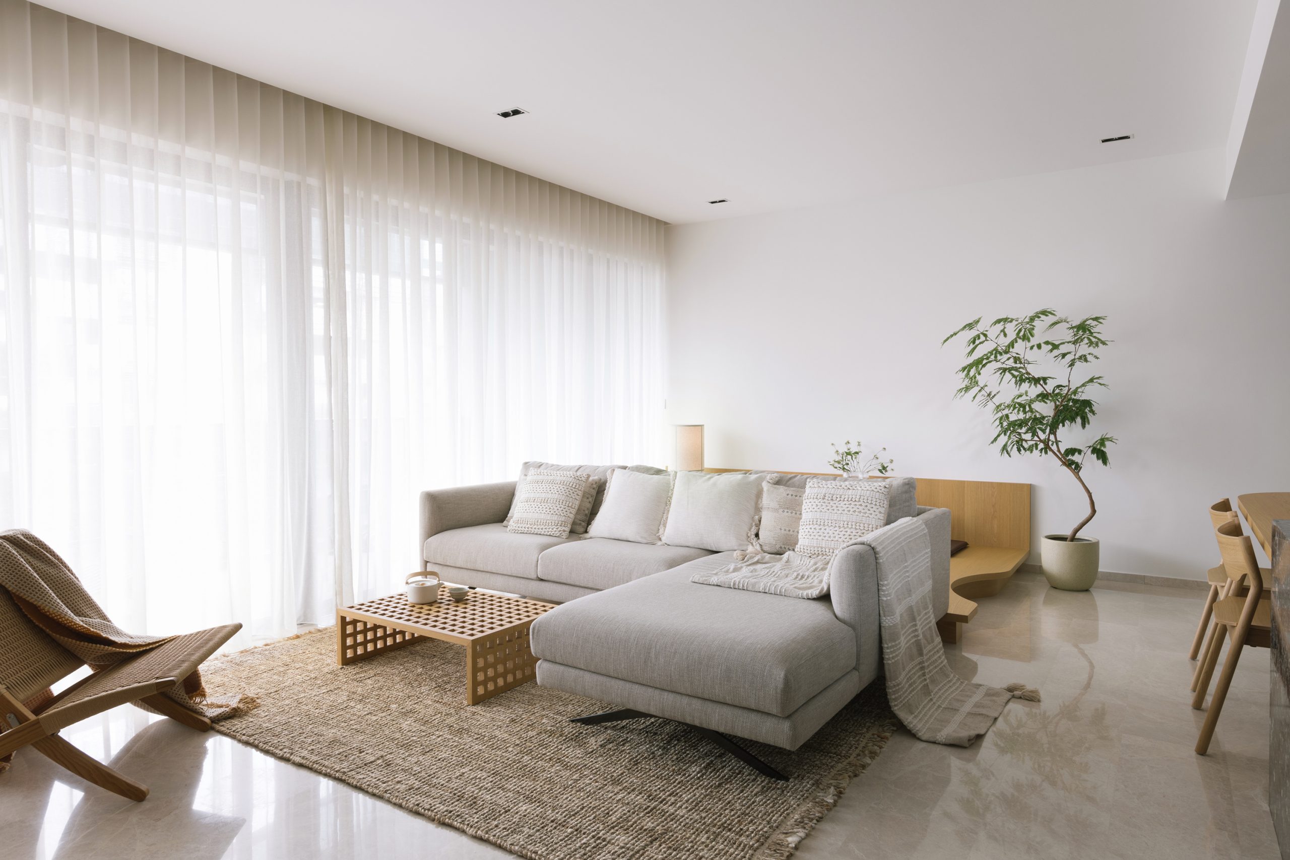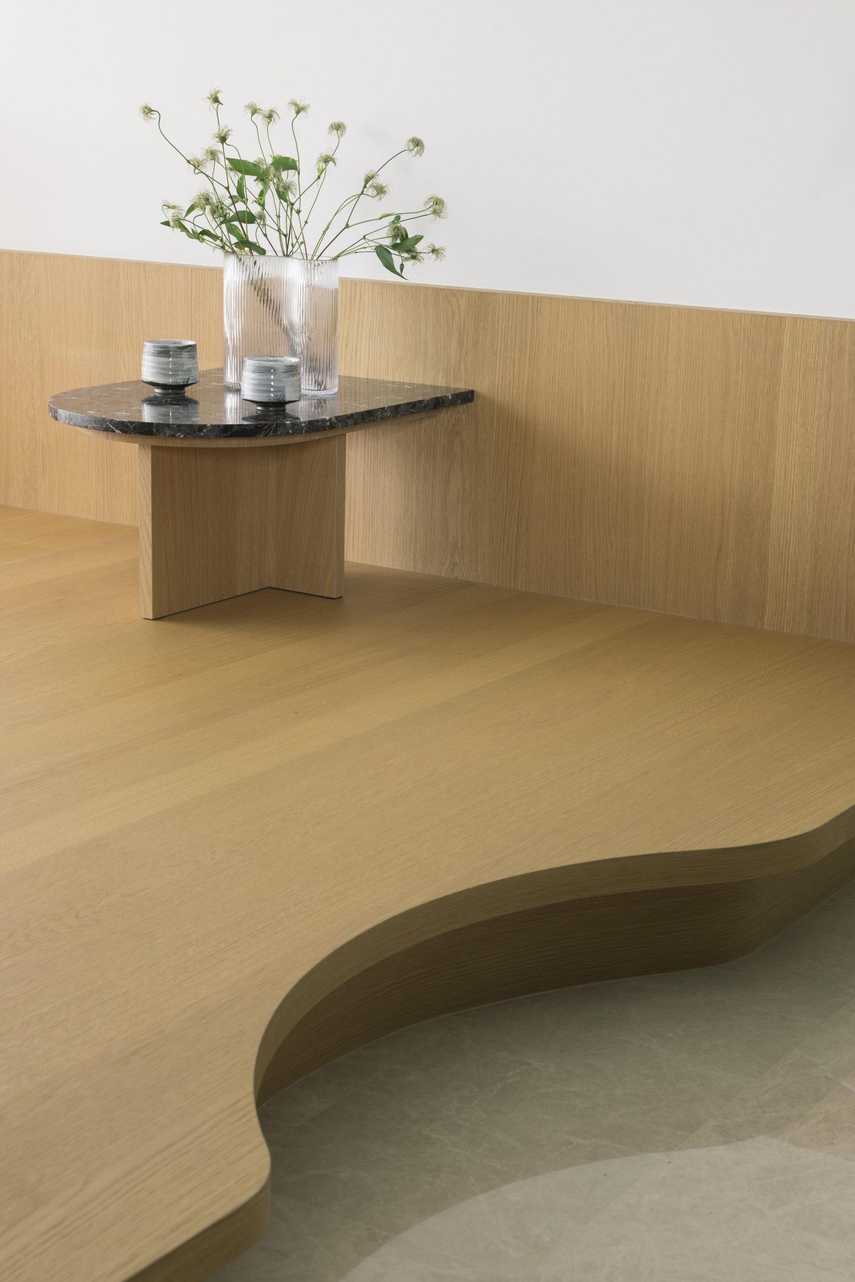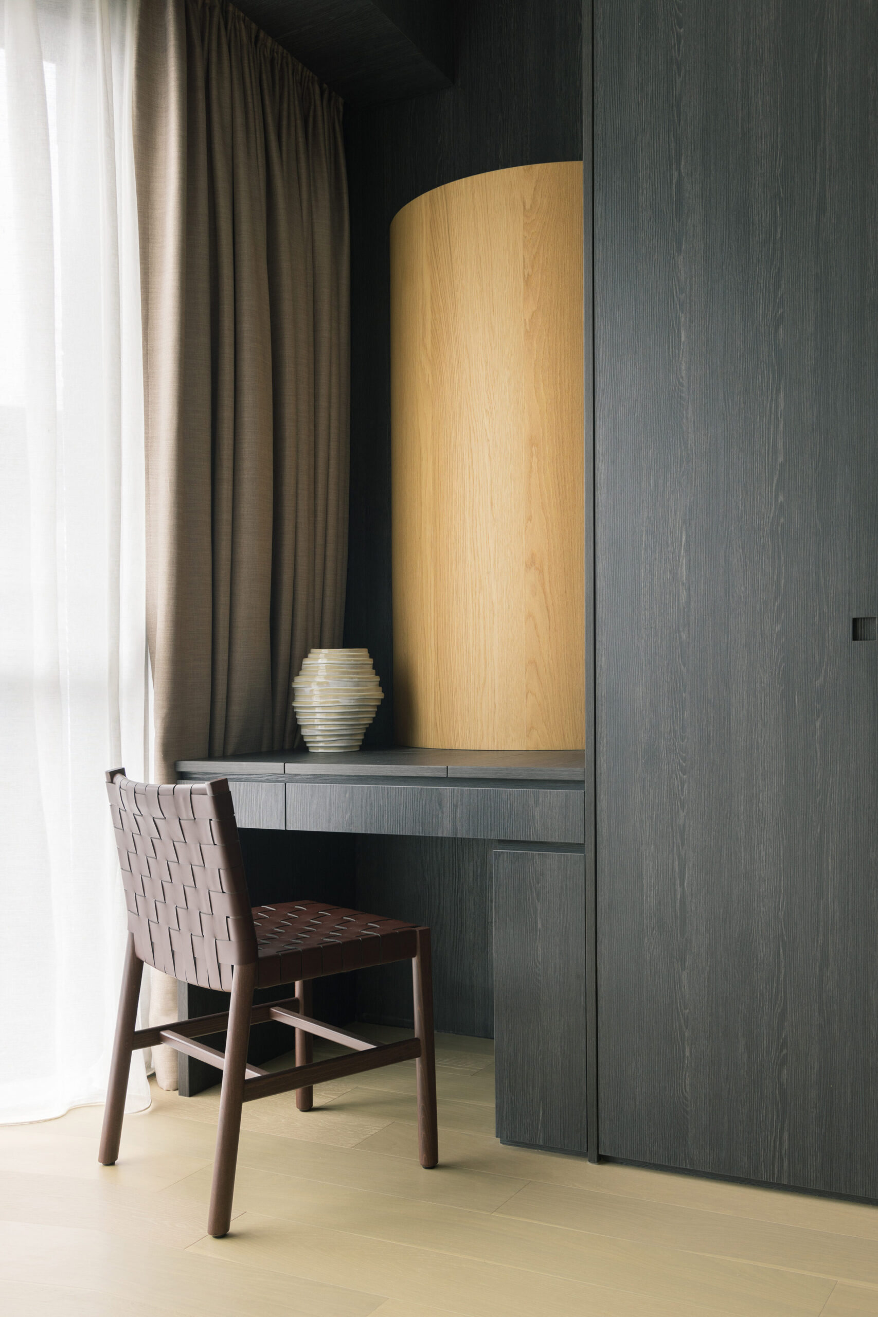 The experience through the apartment is made into an interesting flow of the blend of flat and curved features.