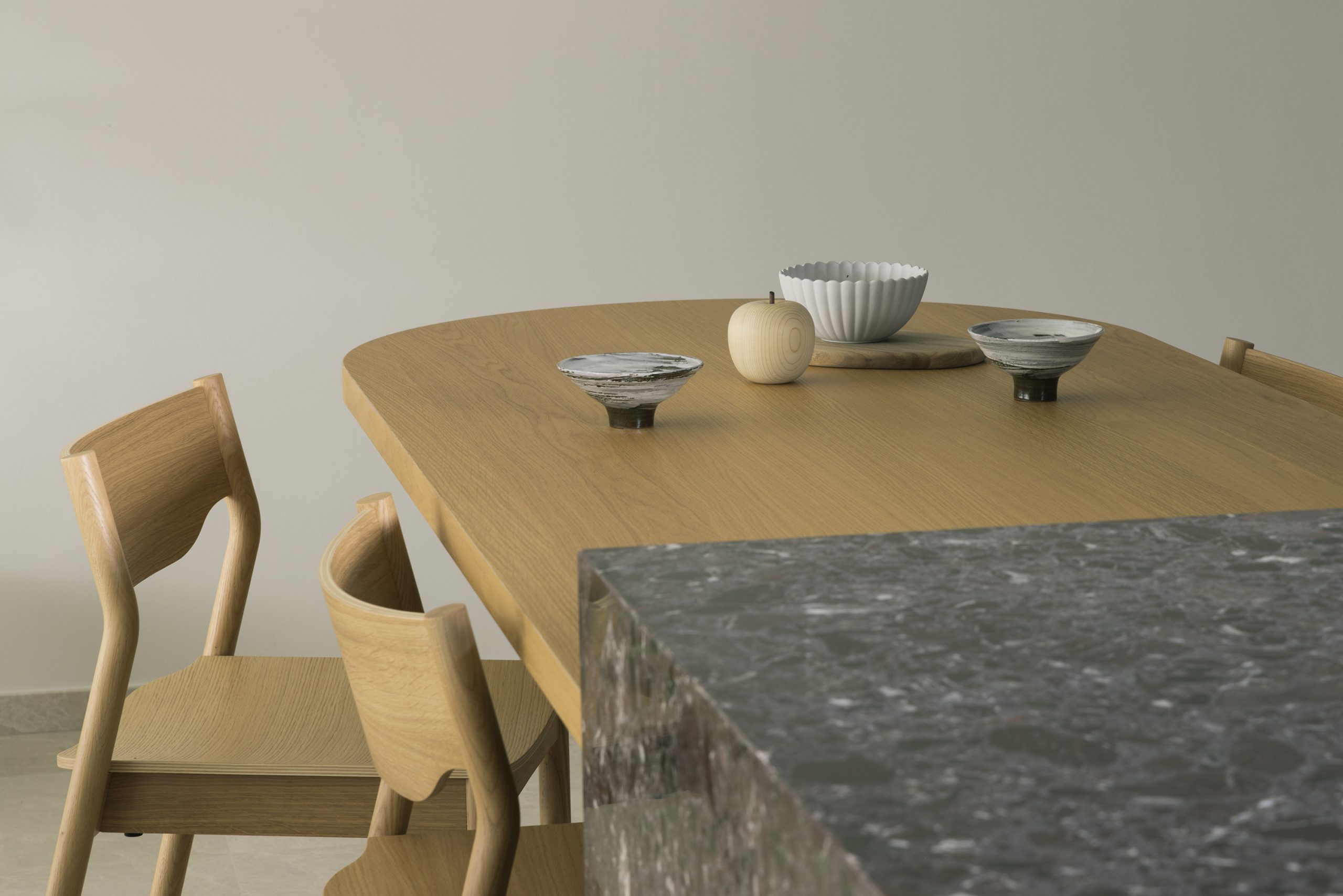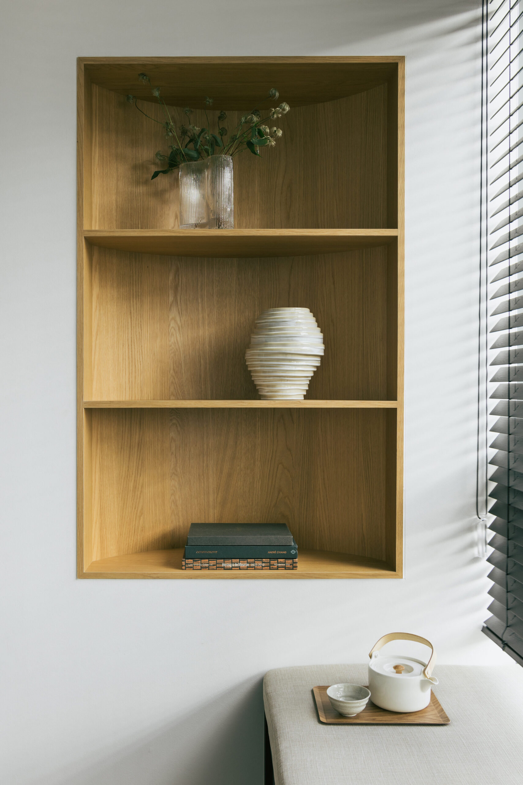 Very often we feel that the expression of curves can be explored on both sides and that informed us to create a concave book shelf that would flush in with an existing wall and allowing the convex form of the curve to be boldly expressed on the other side of the wall.