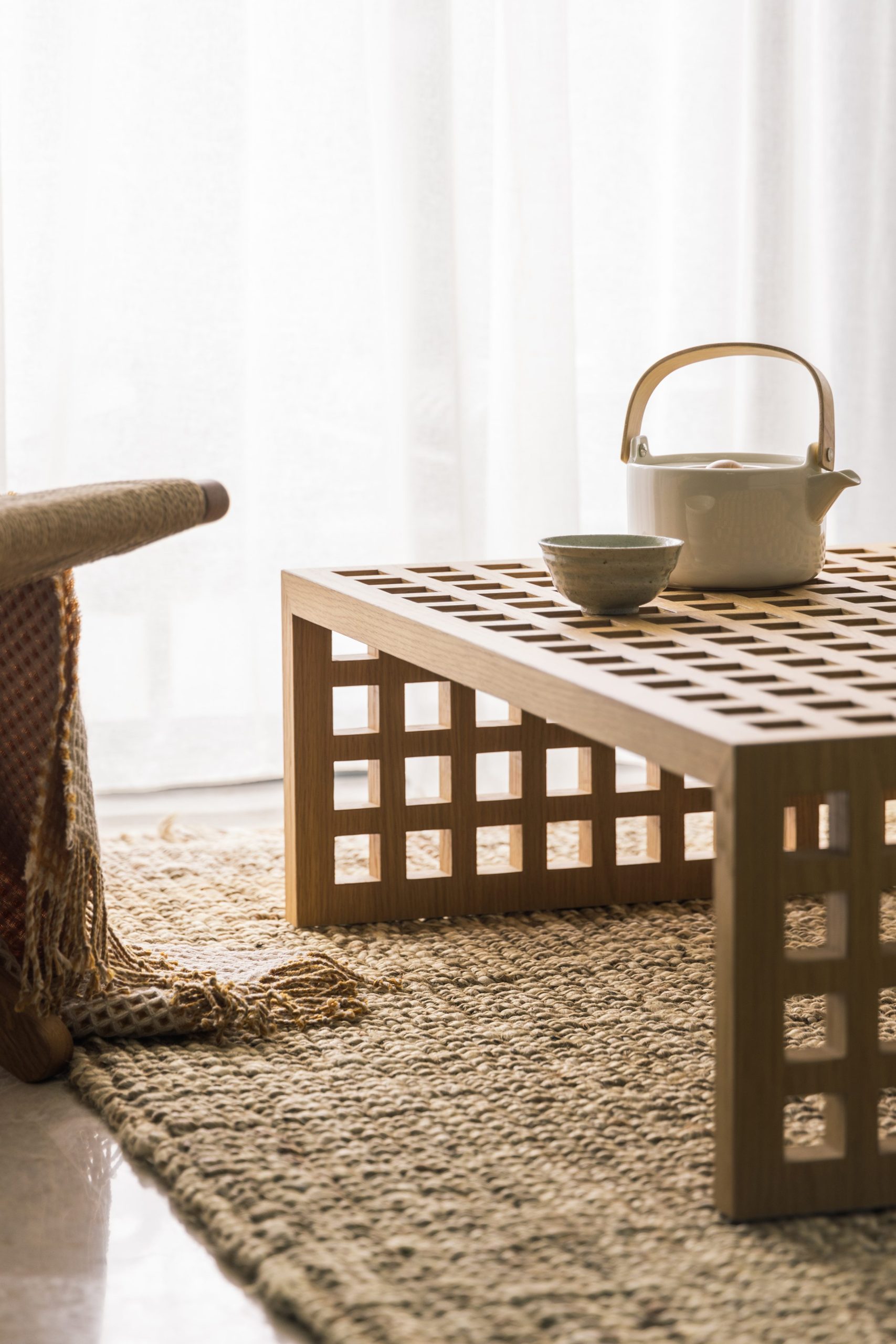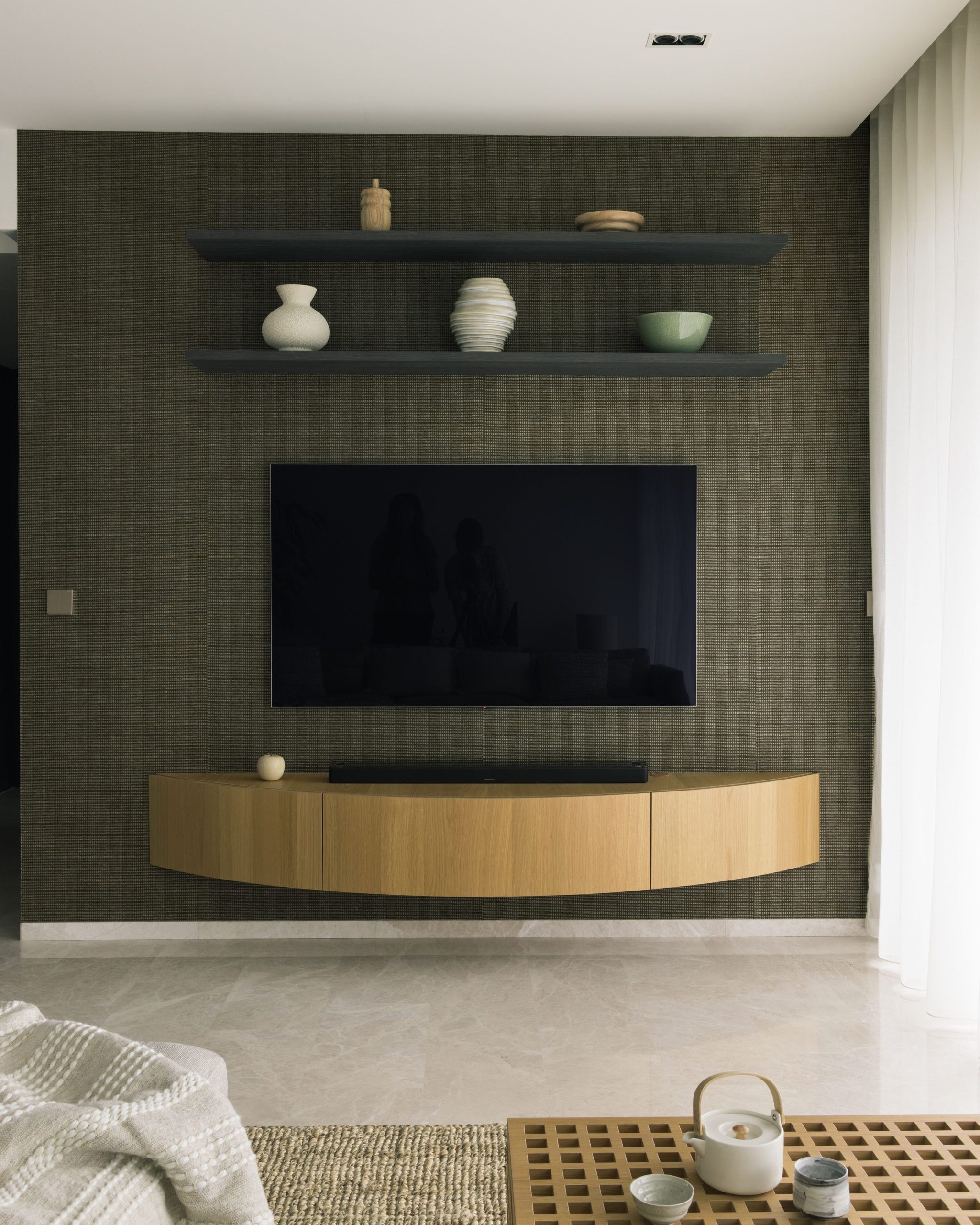 Jadescape interior is a project where we found ways to intersect the rectilinear floor plan with playful curves in the apartment forming parts of the platform, dressing table, book shelves, tv console and dining table.