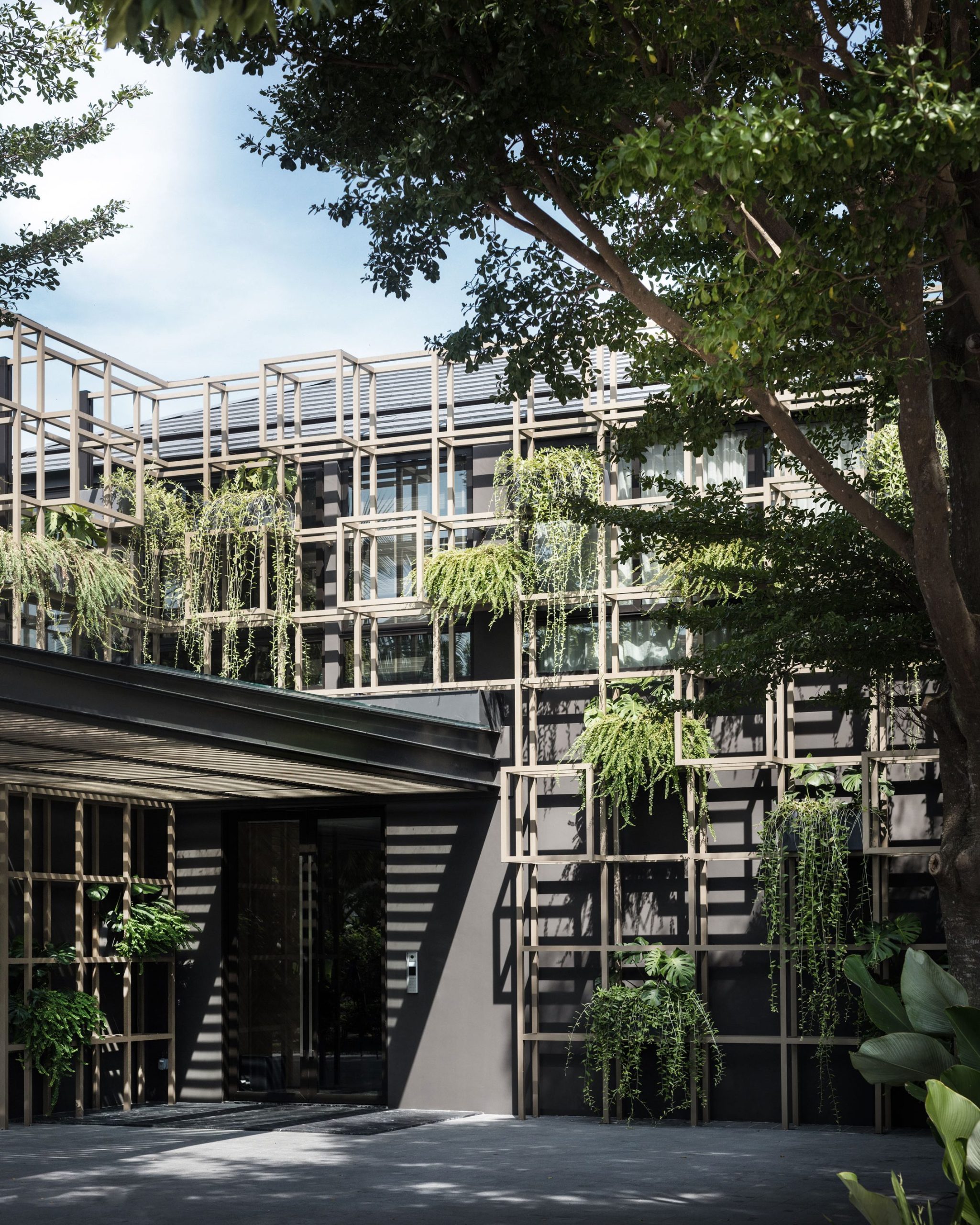 Additionally, the green façade offers shade and pleasant views. The frame comprises 800 by 800 cuboids that form a tectonic, cloud-like volume when viewed straight on, it appears as a planar lattice.